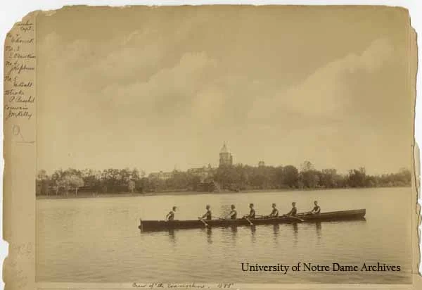 "In addition to the Boating Club, a Social Rowing Club was also established in 1867, and boasted fifteen members. At the time, boating was the near equal of baseball in popularity. The boating club was founded 'for the physical, as well as the mental education of its members, both in the art of rowing and sailing. The beautiful lakes described in the prospectus of this catalogue sufficiently indicate that pleasure accompanies this branch of education.' The first two boats, or barges as they were appropriately called, were the four-oared Santa Maria and the Pinta. Annual races were held on St. Edward’s Day and during Commencement.